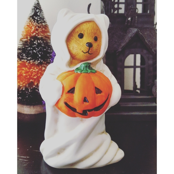 Vintage ceramic halloween ghost holding pumpkin lighted decoration hand painted ghost holding pumpkin. It is a ceramic ghost figurine with a pumpkin head.